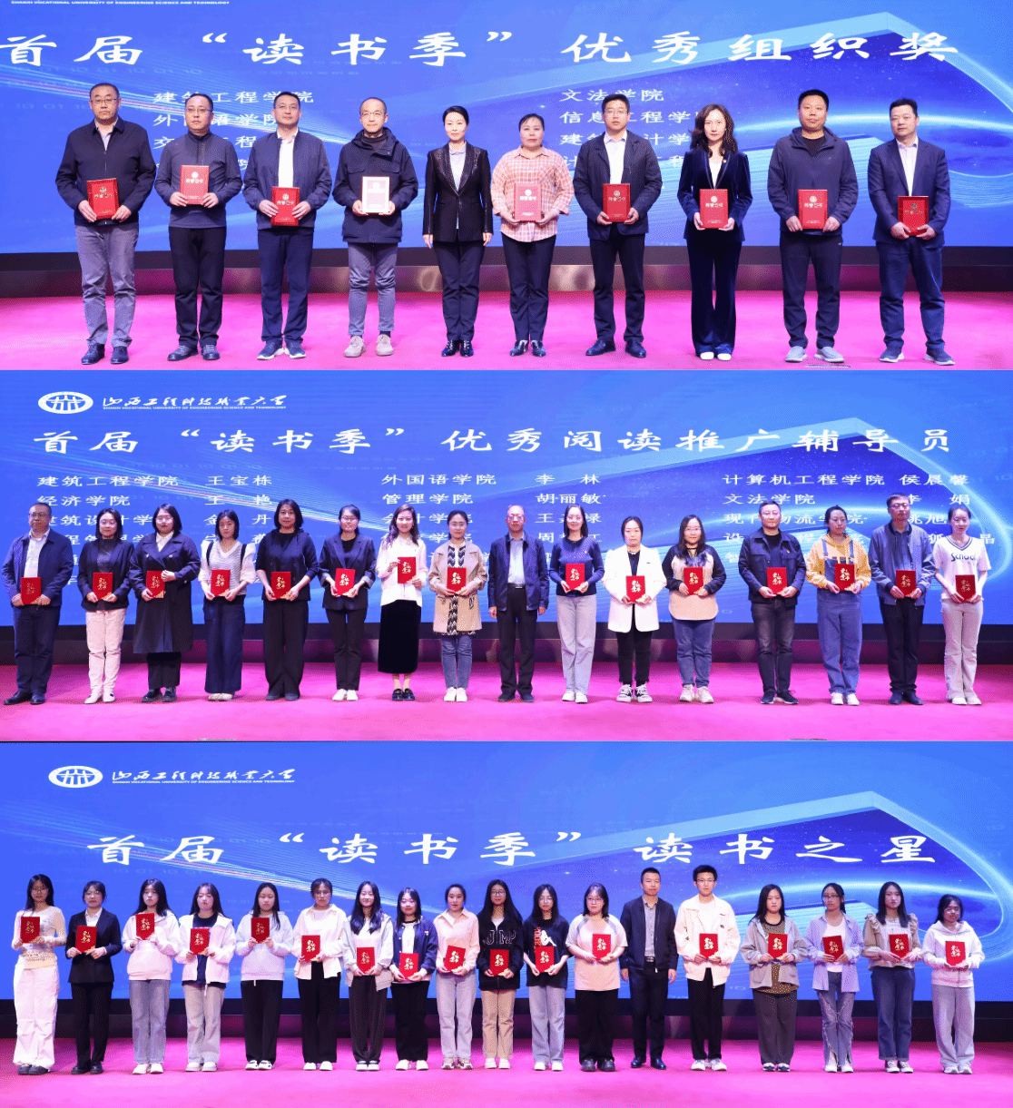 大会宣读了关于学校首届“读书季”的表彰决定。石瑛、郭文彦、图书馆副馆长马小培分别为受表彰的建筑工程学院等10个优秀组织奖、建工2301B班等18个“书香班级”、王宝栋等17名优秀阅读推广辅导员和范智芳等53名荣获“读书之星”称号的学生颁发了荣誉证书。获奖的优秀集体和先进个人代表分别进行了发言。
